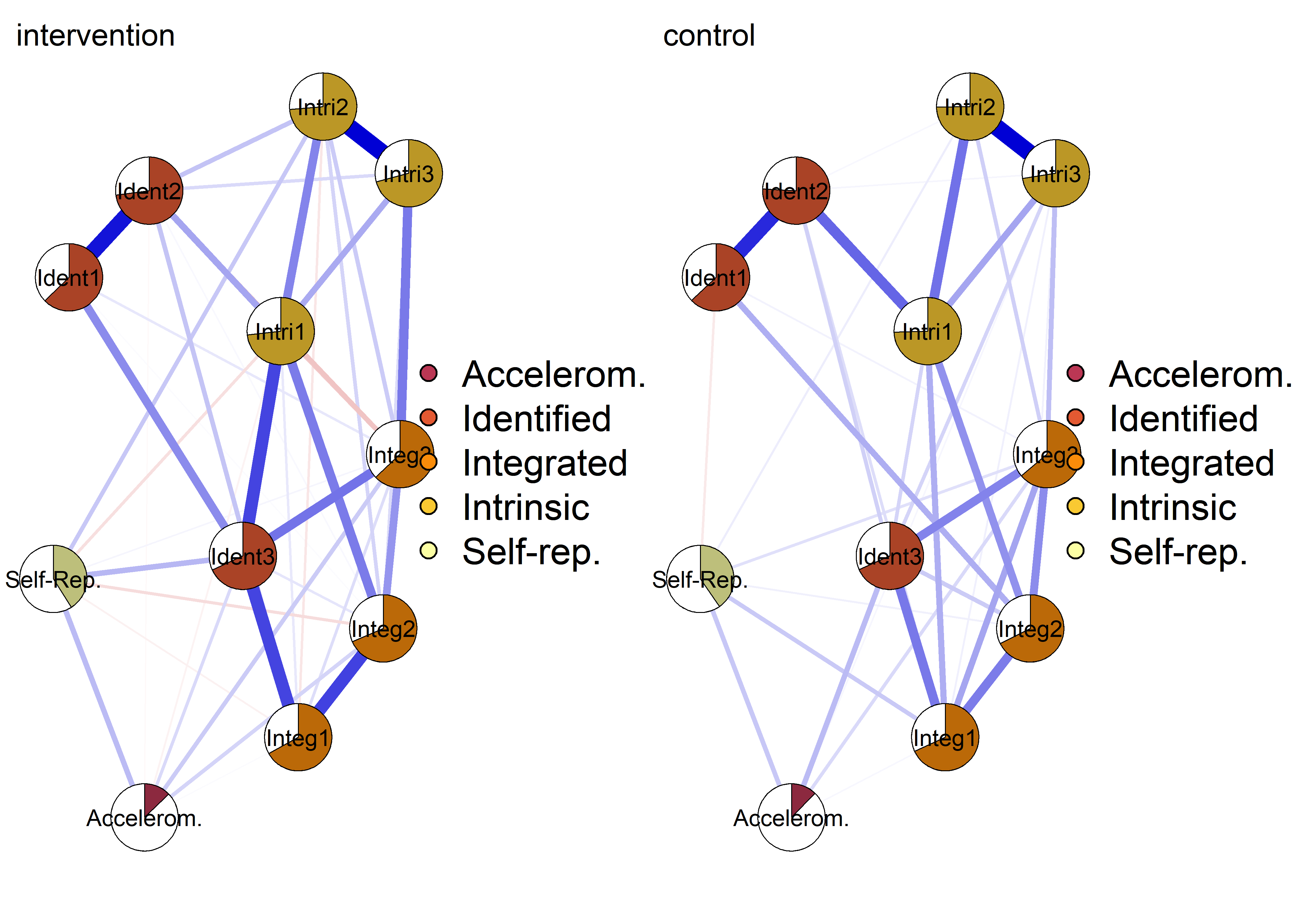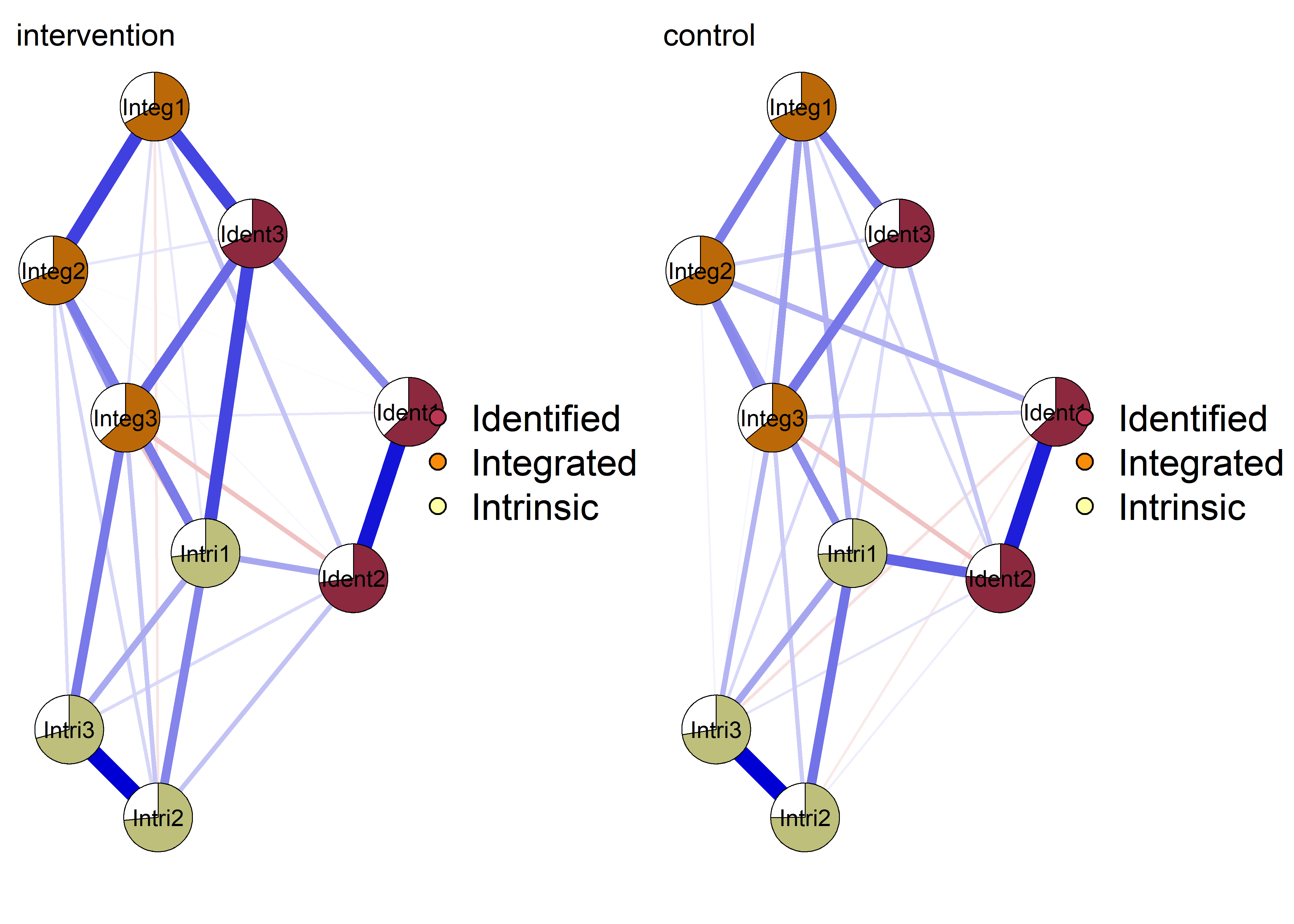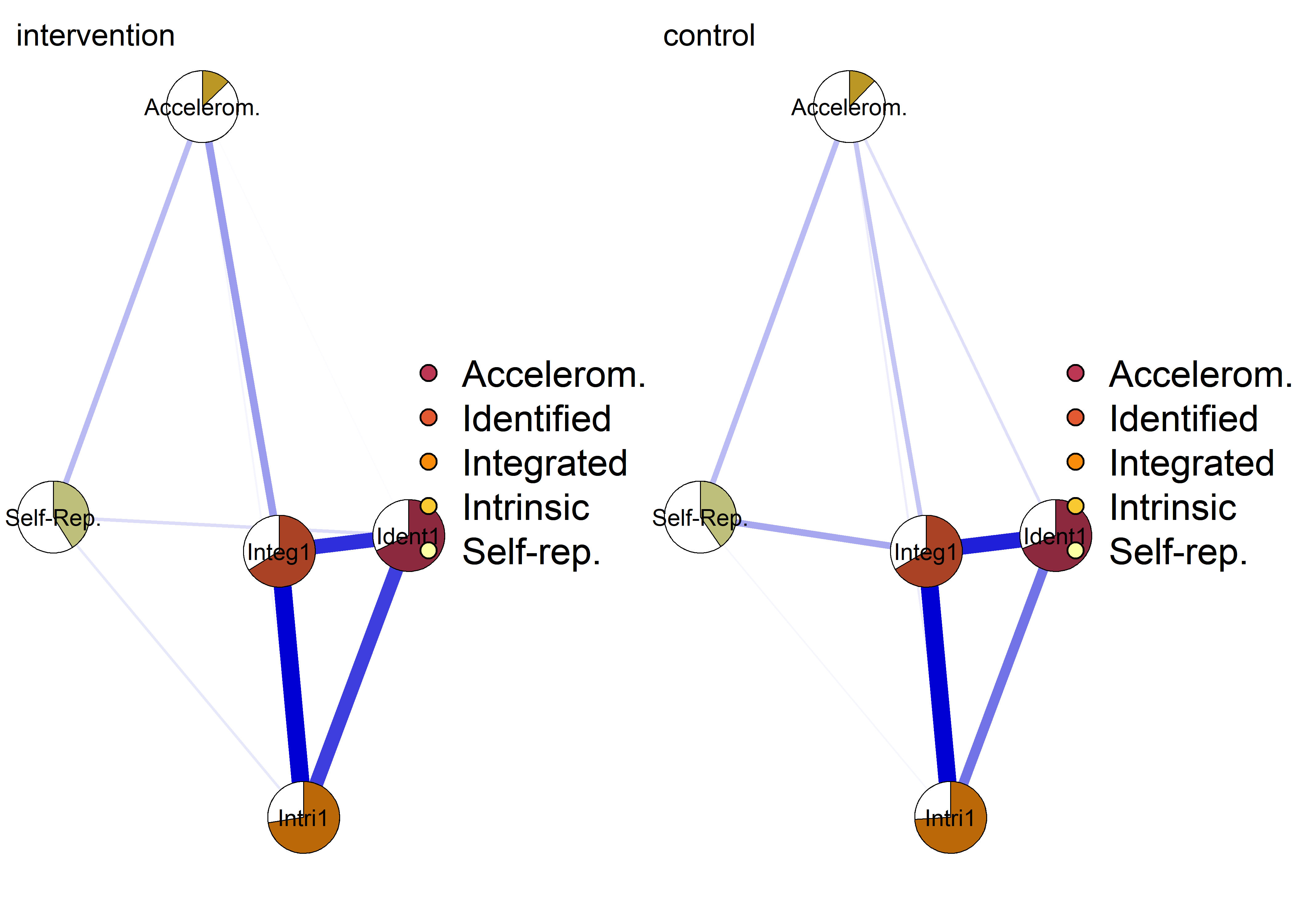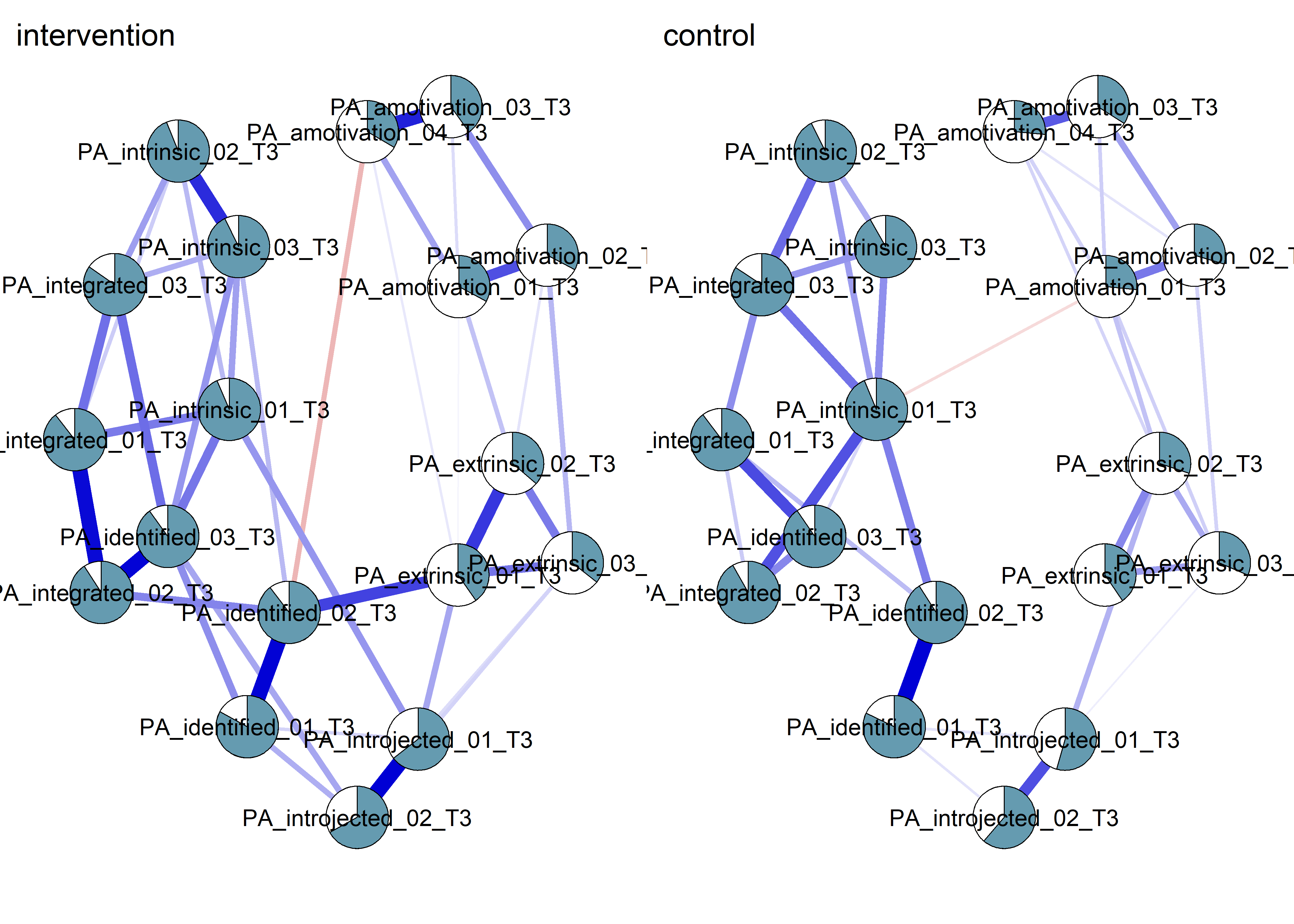 cat("Correlation between intervention and control edge strengths:", cor(qgraph::centrality(nwintervention)$InDegree, qgraph::centrality(nwcontrol)$InDegree))Correlation between intervention and control edge strengths: 0.963327